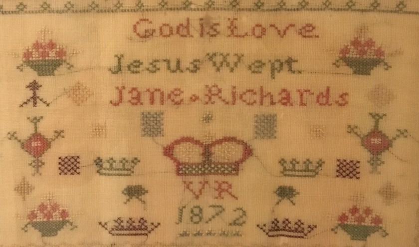 Above a section of my Great-Grandmother’s sampler, completed age 7.
