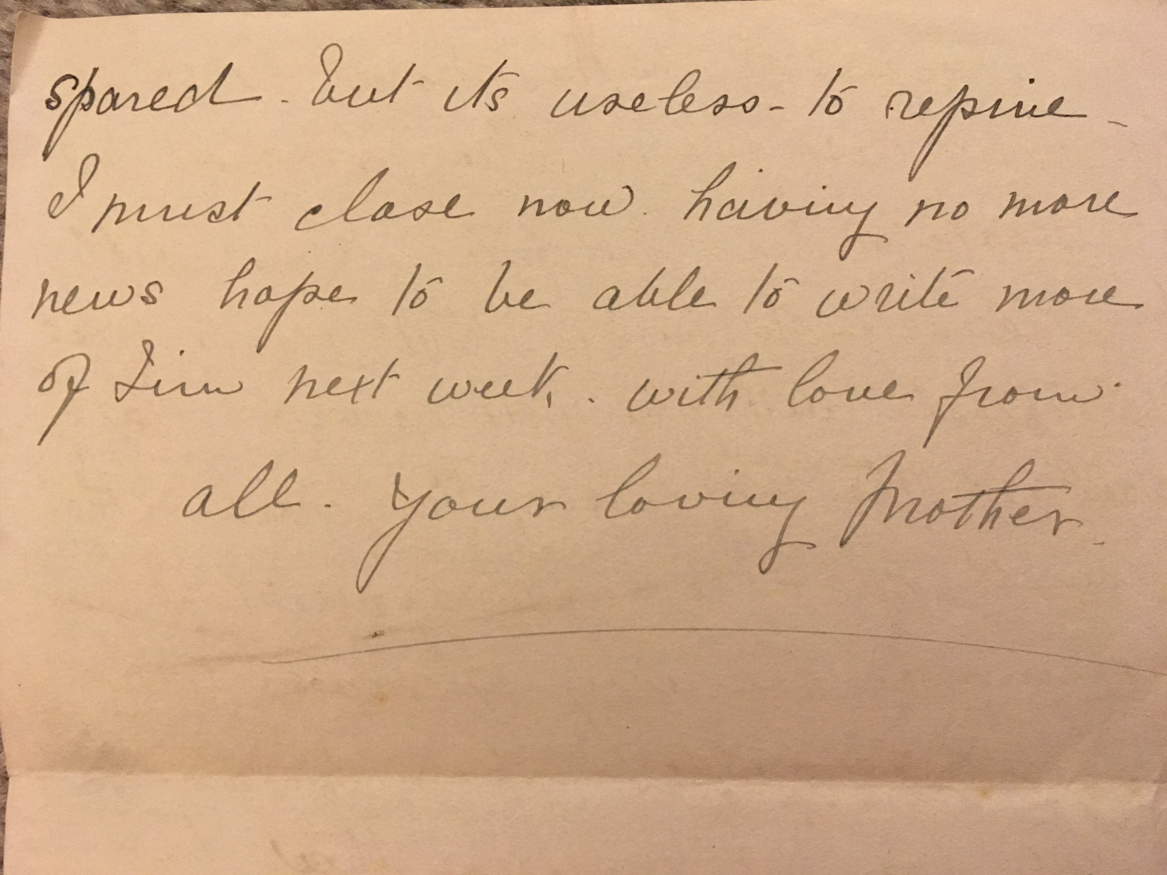 I know the letter that I hold in my hands is near one hundred years old, yet its age is betrayed neither by fragile paper nor faded ink but by the script of my great-grandmother’s handwriting. Jane Mabey writes to her son John and the content is timeless. I am struck by how my own mother might have written such a letter to me, on subjects of weather and family friends and that self-deprecating “nothing in the way of news”. And yet there is an out of the everyday and ordinary about this letter – for Lloyd is missing and Jim’s whereabouts are unknown, although the family know he was gassed. My great-grandmother’s anxiety and sorrow is simply, humbly expressed and no less powerful for that. It is her loss, and abiding love for all her children that transmits through the pages so long after the heart that beat for them has ceased. Lloyd and Jim were my grandfather’s younger brothers. Lloyd did not come home.