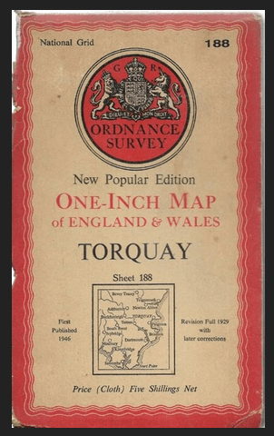 On Monday I bought a 1” map of ‘Torquay’ – on cloth for 2/6. They had quite a pile of them in Smiths’, quite in the open, so I don’t know if they are old stock or if the O.S. have printed some since war. The map goes from Teignmouth & Dartmeet (North) round the coast past Start Point to Bigbury-on-Sea, which I have heard is a very nice place. We do plenty of marching about from class to class, and it is very nice as there is always something interesting to see, especially out in the bay. This morning was lovely and clear, and the countryside over towards Paignton looked very lovely.