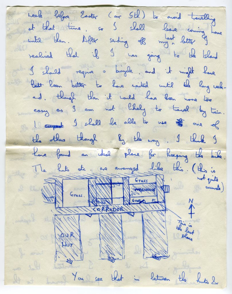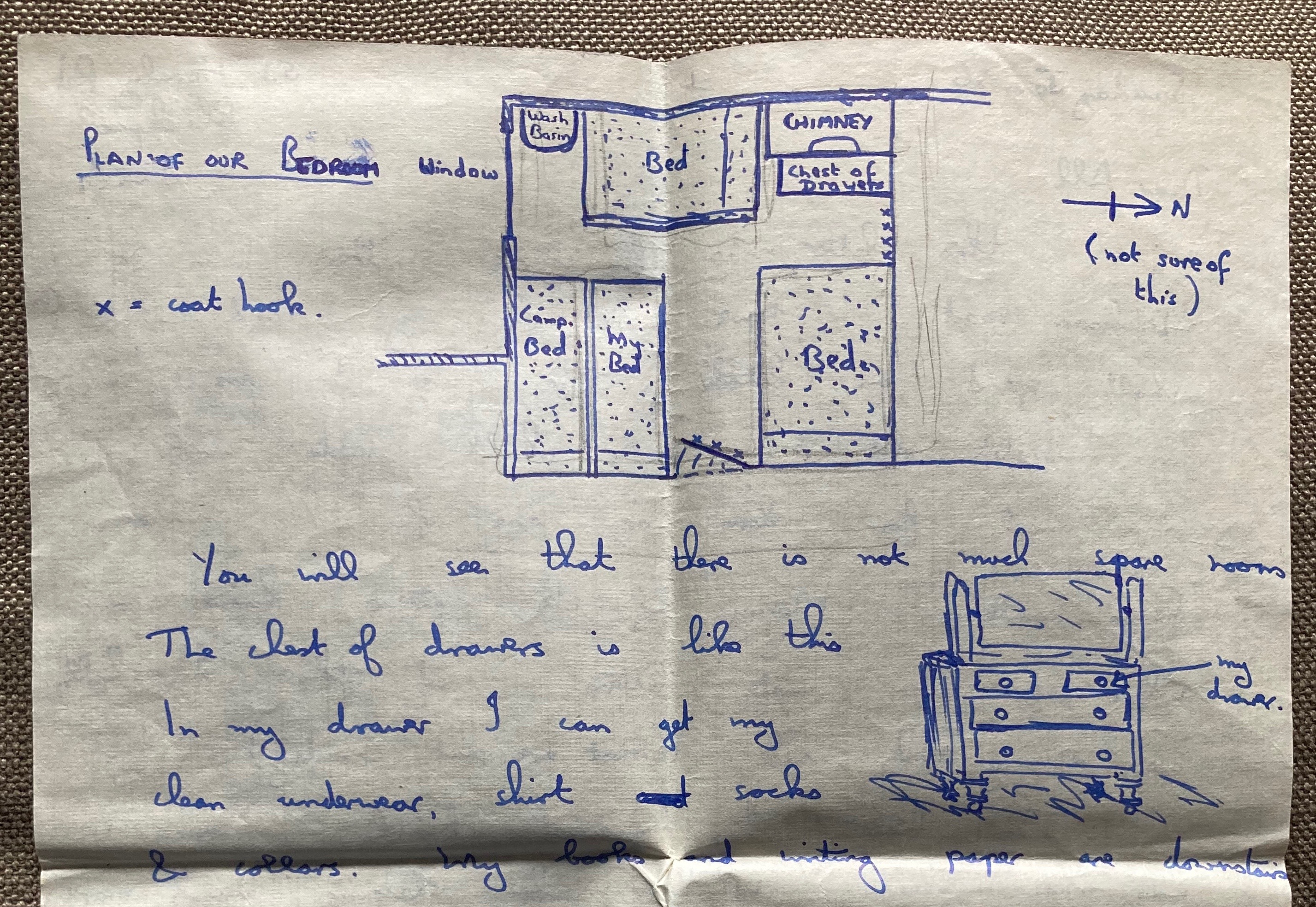 I’m afraid I can’t reply to your last two letters, as they are in my locker. I hope Peter’s second operation goes well (or has gone well). I still have Jean’s drawing, which I will return next time if I remember it. My love to you all, from Albert.